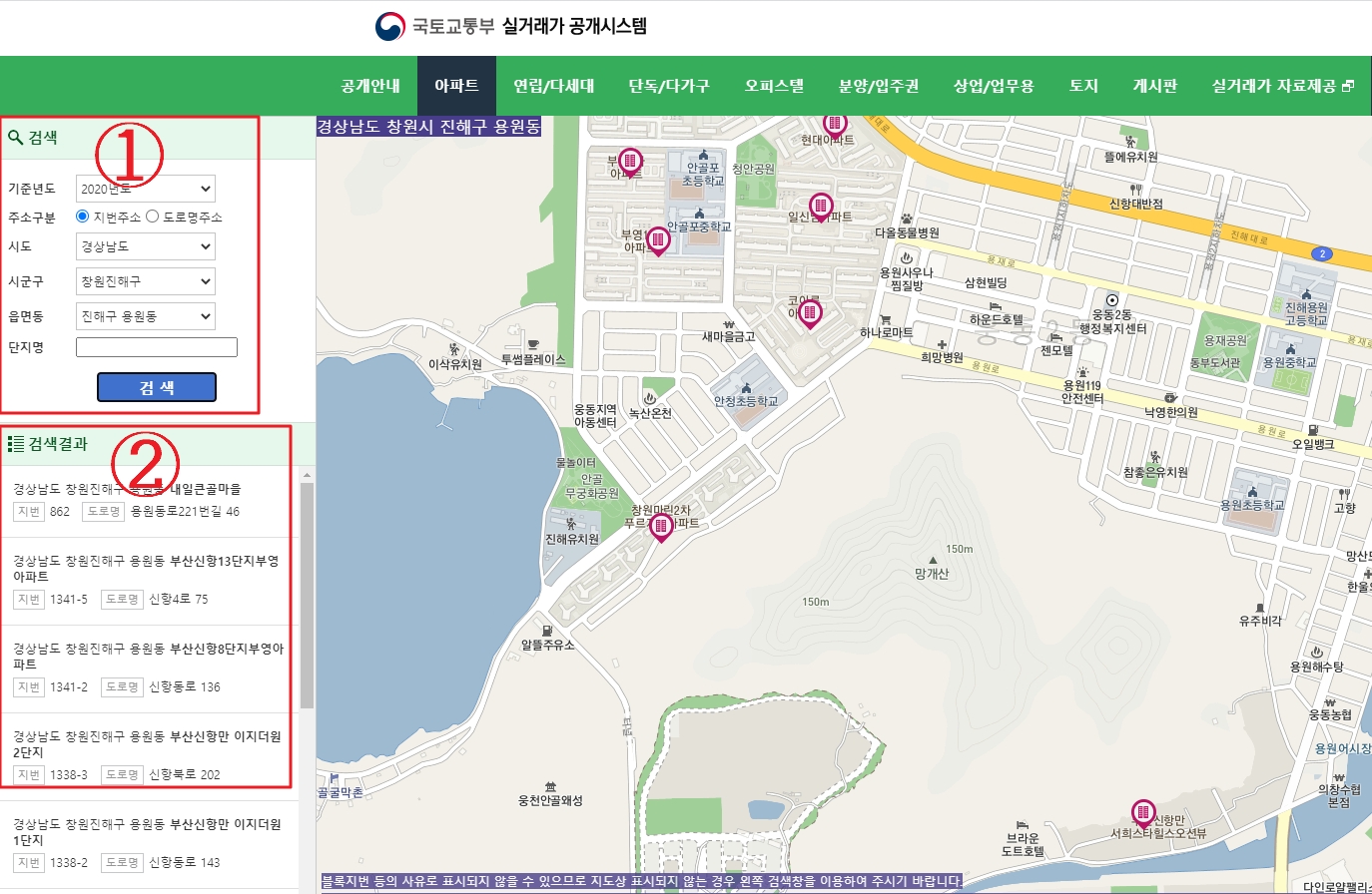 저는 진해구 용원동에 있는 "코아루" 아파트를 검색해보았습니다.